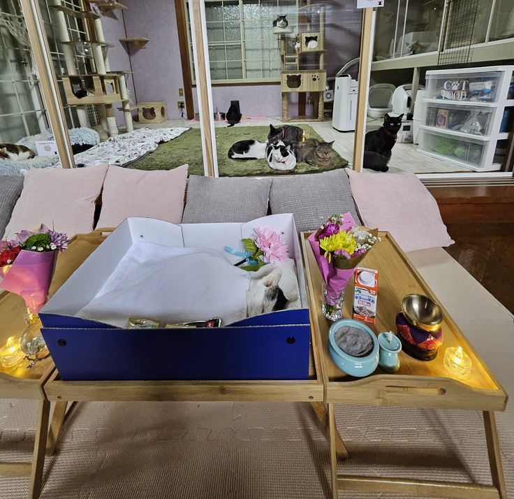 少しでも役に立てばと動物介護の勉強をして動物介護士と介護施設責任者の資格取得しました。気づけば12匹に私の部屋は8畳たらず介護用具もあり自由に動けるスペースがない…猫たちと暮らせる家を探したどり着いたのが蔵王町遠刈田温泉の別荘地。猫たちのお世話をするためには私の年金だけでは無理…収入が得られるスペースを確保出来る物件…2024.3物件が見つかったものの資金などなく銀行へ掛け合いました…。4ヶ月5件目で…足りない分は親兄妹からトータル2000万円(返済期間20年)息子と猫たちのお部屋作り、カフェオープンへの際にはたくさんの応援を頂き本当にありがとうございました。