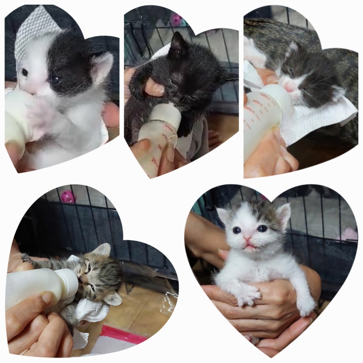 上段左こまちちゃん♀️保護時はまだへその緒がついてました。心臓に問題が何度か心停止を…。下段右ゴマちゃん先天性小脳低形成、関節変形、発育障害で成長につれ介護が必要と…更に生後3日の仔猫たちも…