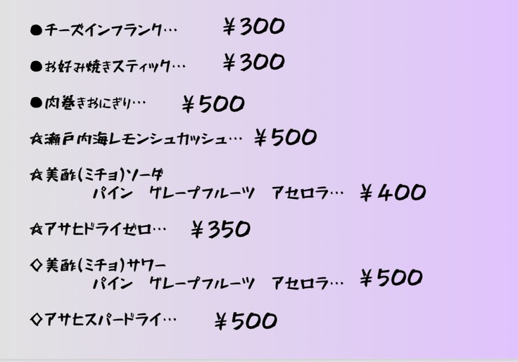 *フランク、お好み焼き串、肉巻きおにぎり、レモネード、氷カフェ2種の仕入が必要です。