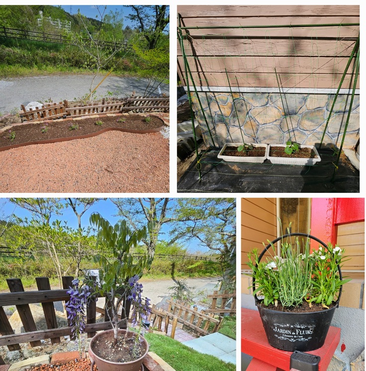寄せ植えや新しい花壇も作り芝桜を植えたり、球根もプラス、きゅうりの支柱ネット張り…
