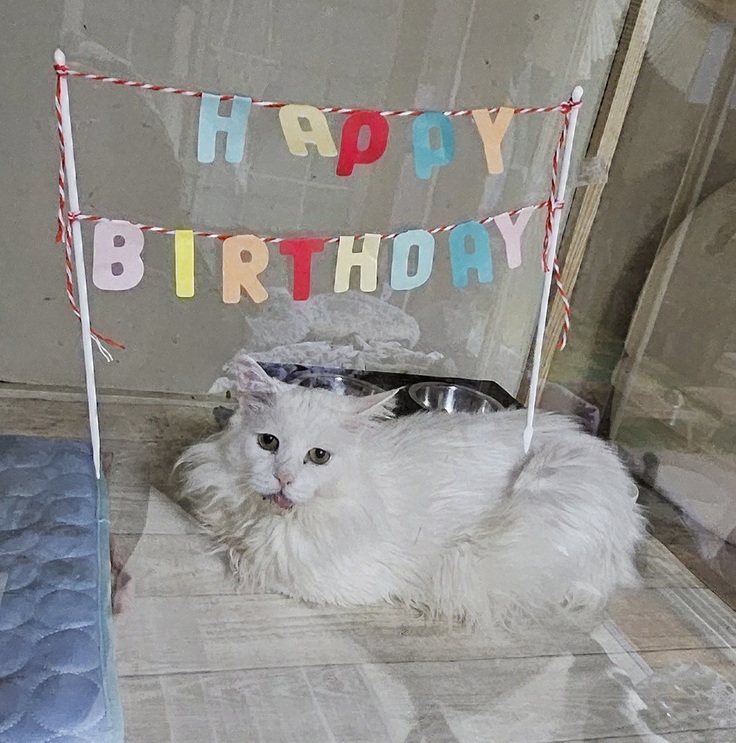今日はシルクくんを保護して1年…猫AIDSと事故の影響で歯が3本しかなかった為に年齢が分からなかったのでこの日をお誕生日にしました。猫の城の1年生です!