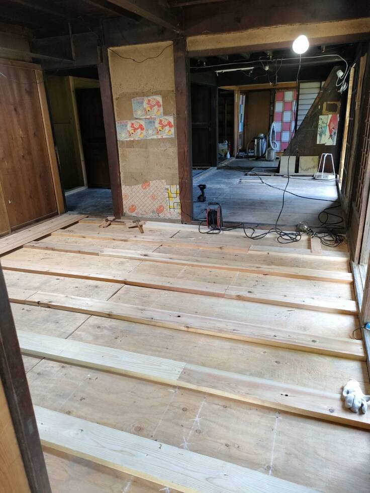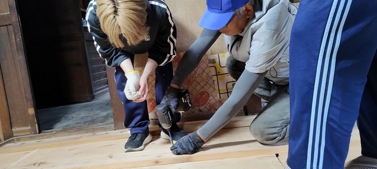 午後からはプロの大工の方を含む地域の応援メンバーも加わり、本格的な床板貼り作業を行いました。隅の調整も丁寧に行い、無事に1部屋分の床板が完成しました。