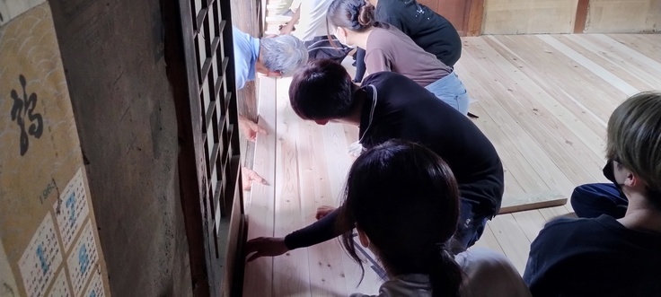 午前9時からは、床板貼りワークショップを実施。地域の方々、松下ゼミの学生の皆さんが参加し、宮下さんのご指導のもと作業を進めました。