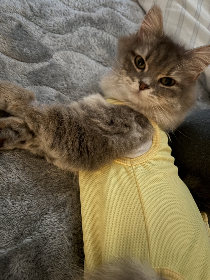 抜糸も無事に終わり、もうしばらくは手術服を着て過ごさないといけないシャルちゃんです。