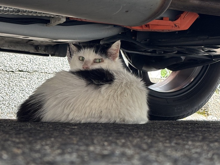 私の車の下でくつろぐ白黒誰かが