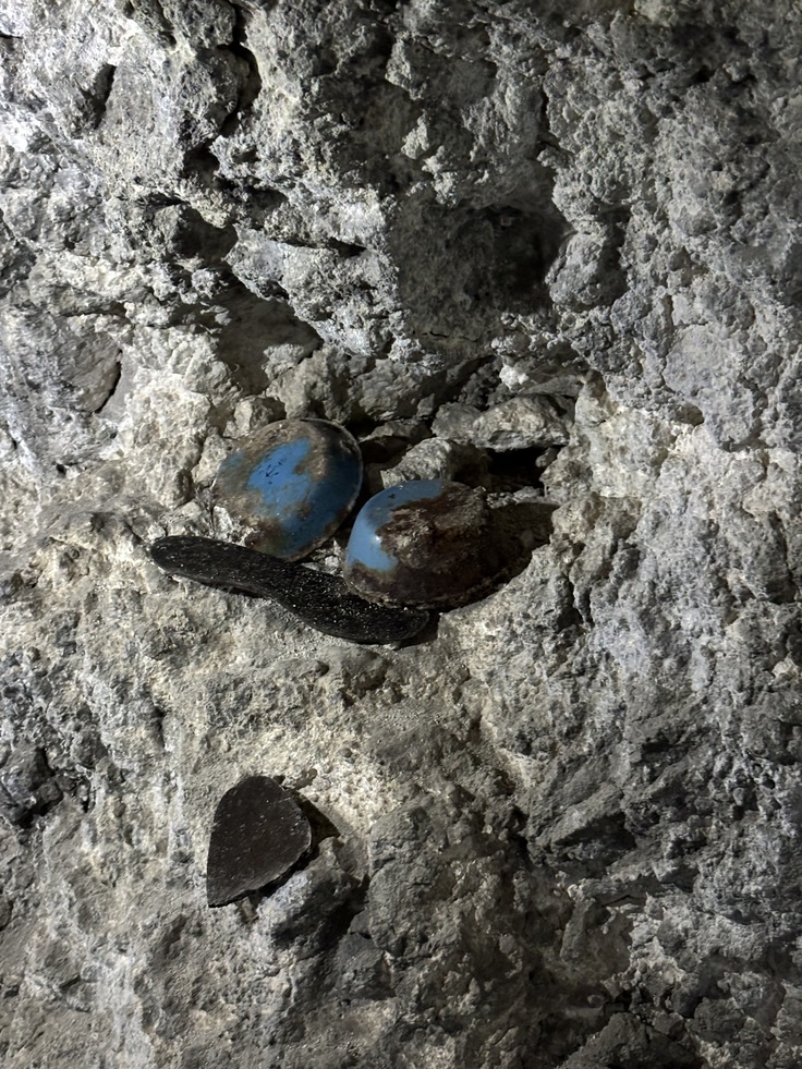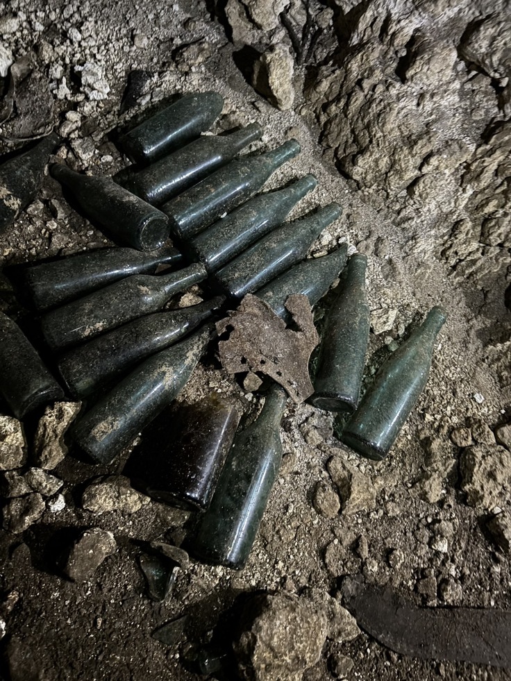 写真にも写っているように、洞窟内には数多くの瓶が残されていました。兵士たちはこれらの瓶を使って、洞窟の天井から滴り落ちる水を集めていたとのことで、その数の多さに驚かされました。さらに、酸素ボンベや海軍が使用していたとみられる皿も散乱しており、当時実際に人々が生活していたことを強く実感しました。