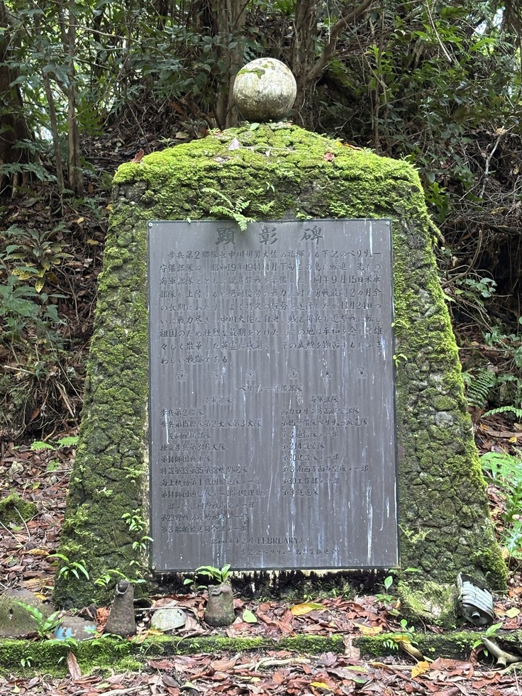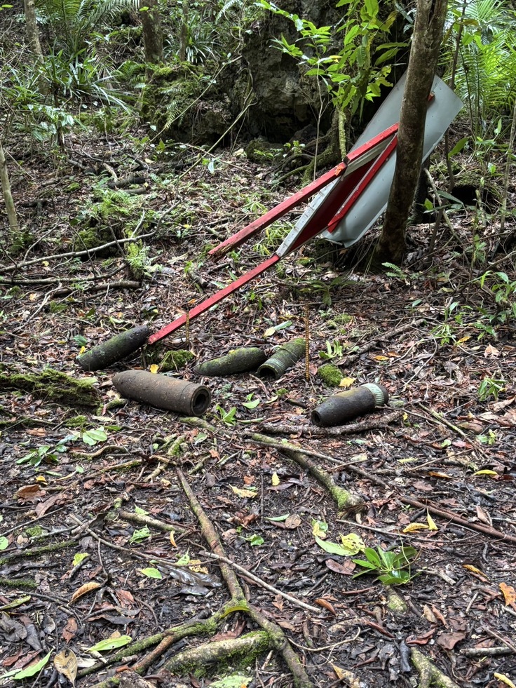 写真にも写っているように、道の途中には未だ不発弾が撤去されていない場所があり、小道には赤い柱の看板で注意喚起されています。また、中川州男大佐(歩兵第2連隊長)が率いたペリリュー島守備部隊の顕彰碑と多数の塹壕も見られました。四方八方に塹壕を掘ることで、山を登って攻めてくるアメリカ軍を包囲し、集中攻撃するためだったと言われています。それはまるで難攻不落の城のようでもありました。