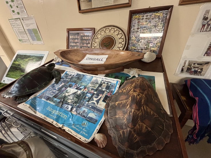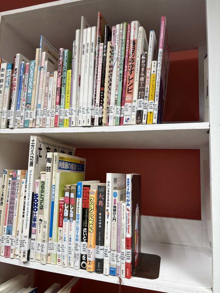 図書館には多様な本がそろっており、日本語の借用語を紹介する本や歴史写真集もありました。亀の甲羅やサンゴも展示され、地域の自然や文化を感じました。