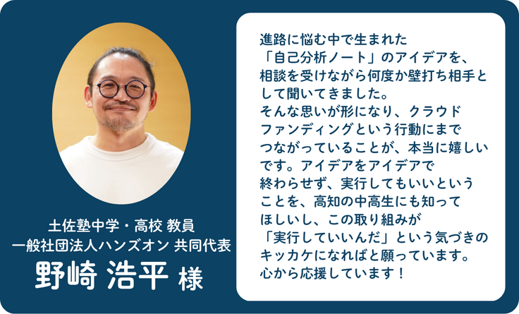 このプロジェクトがまだアイデアのみの段階だった頃から、親身にアドバイスをくださっている野崎浩平さん(土佐塾中学・高校 教員/一般社団法人ハンズオン 共同代表)から、応援メッセージをいただきました!