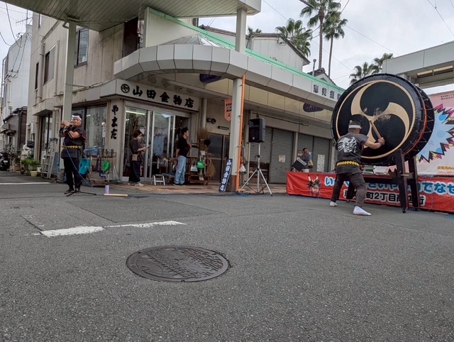 10月26日(日)の12時30分より、伊吹龍心太鼓保存会のメンバーは、宇和島恵美須町2丁目商店街様からの依頼により、商店街入口のさかもとカバン店さん前で、3曲演奏しました。