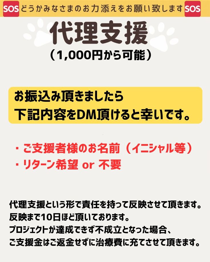 ・プロジェクト不成立となってしまった場合、頂いたご支援金はご返金せずにアポの治療費に充てさせて頂きます。