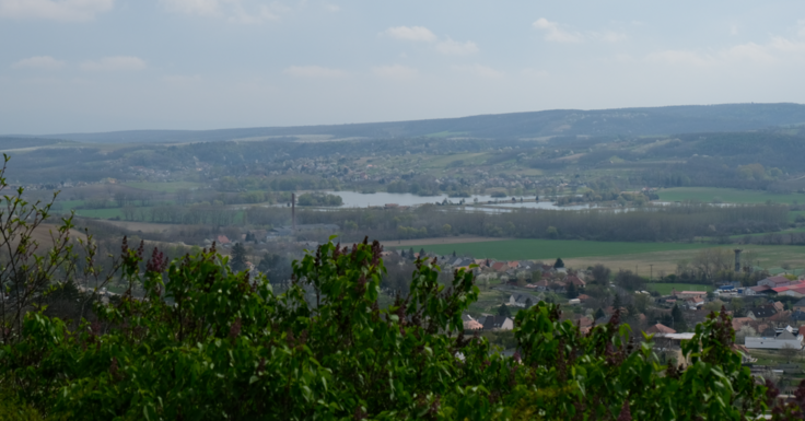この写真は、Nagyさんが住む町・パンノンハルマの中心部、世界文化遺産の大修道院がある高台からの眺めです。池の向こうに広がるのがNagyさんが採蜜する広大なアカシア林です。その広さはなんと東京ドームの10倍近い100エーカー(40.5ヘクタール)もあります。