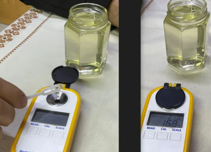 この写真はNagyさんのアカシアハチミツを初輸入する直前、2022年4月にNagyさん宅を訪ねた時のものです。アカシアハチミツ水分は16.8%でした。天然ハチミツに占める水分の割合は国際規格では20%以下とされていますので、大幅に水分が少ない。つまり、ハチミツの濃度が濃いといえます。