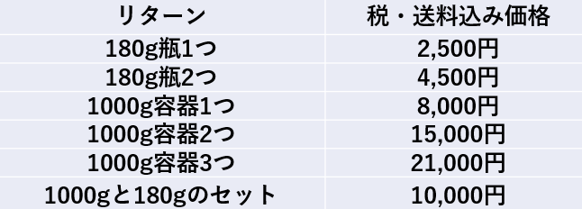 ▼リターンでは送料などを弊社負担、1本は定価の税込み8,000円。1000gとと瓶入りのセットも