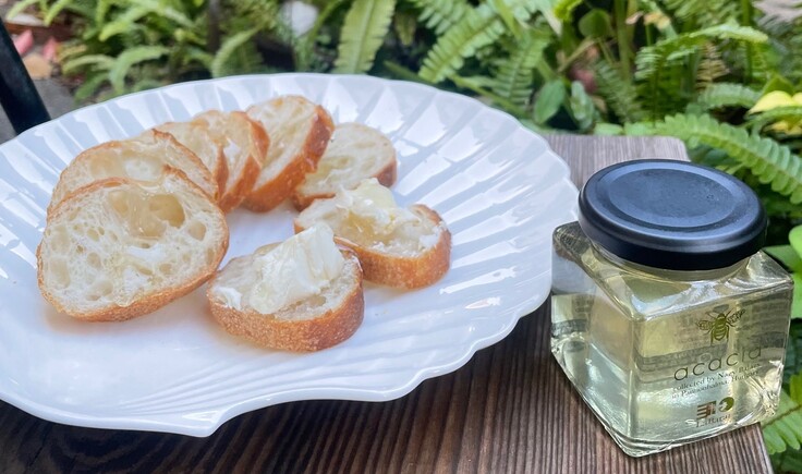 透明なこのハチミツ、食べた瞬間は「水飴?!」と思うほどきれいな味なのですが、濃厚さがある分、徐々に、そしてしっかりとハチミツの味わいが感じられます。