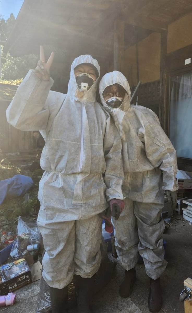 防護服とゴーグル、防塵マスクを着用し完全防備で臨み真っ黒になりながら掃除