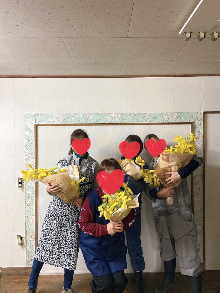 ミモザをいただき張り替えた壁紙の前で記念撮影