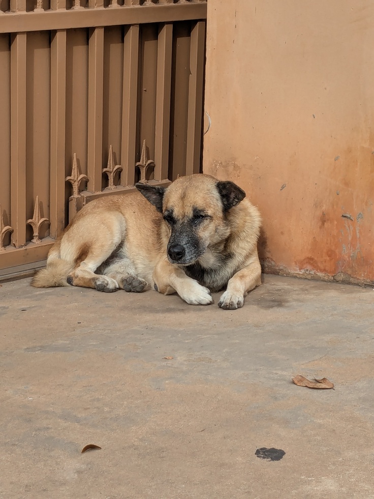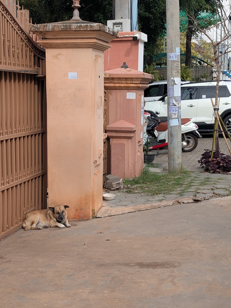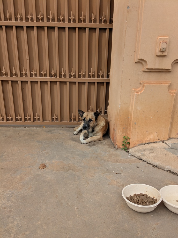 私の宿の近くで最初に見た犬を朝に見つけ、ゴミを食べていたのですぐにフードと水を取りに帰って与える。やっぱり片目が開かないみたいで、少し開けば赤くなっている。