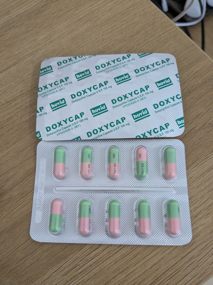 薬局で抗生物質のDoxycap(ドクシキャップ)を20カプセル買い、一日2カプセルをウェットフードに混ぜて飲ませるようにとのこと。しかしまたそこの場所に来るのかどうかも不確か。