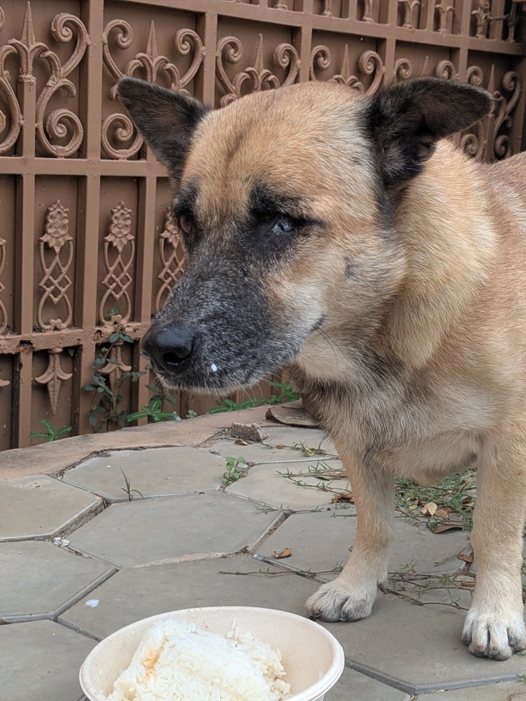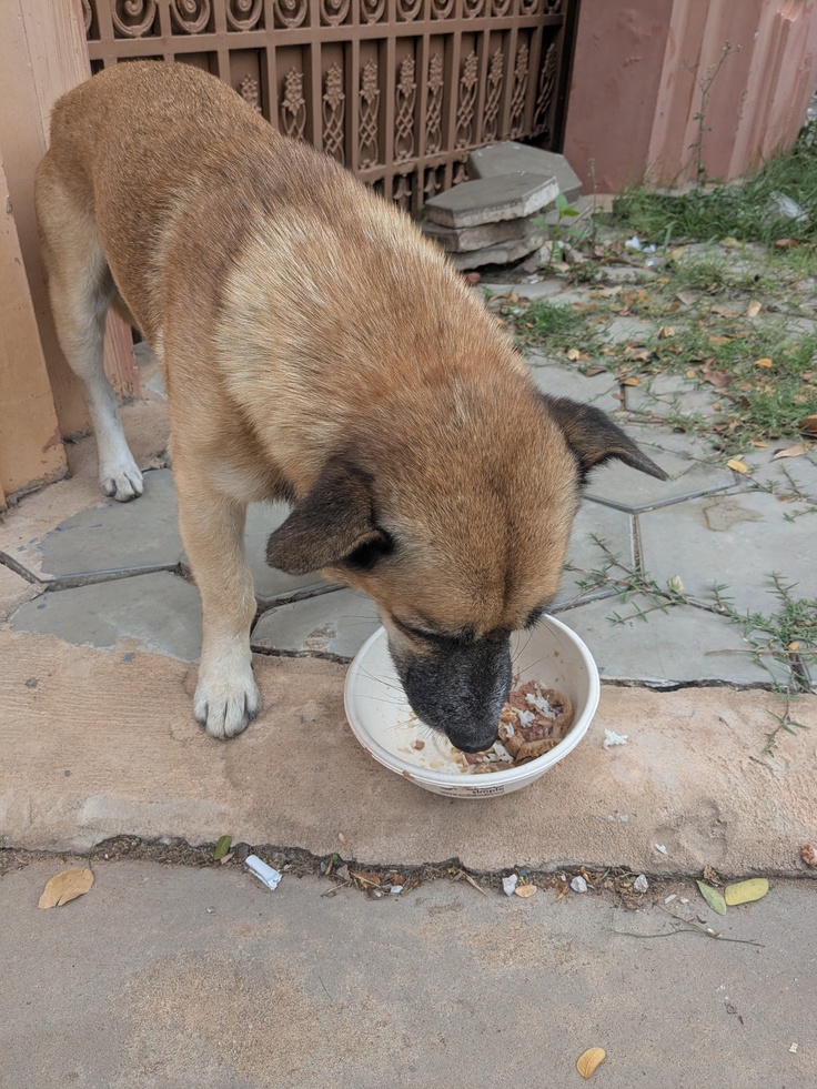 私を覚えているのだろう、近づいてきてご飯を催促するように吠えた。