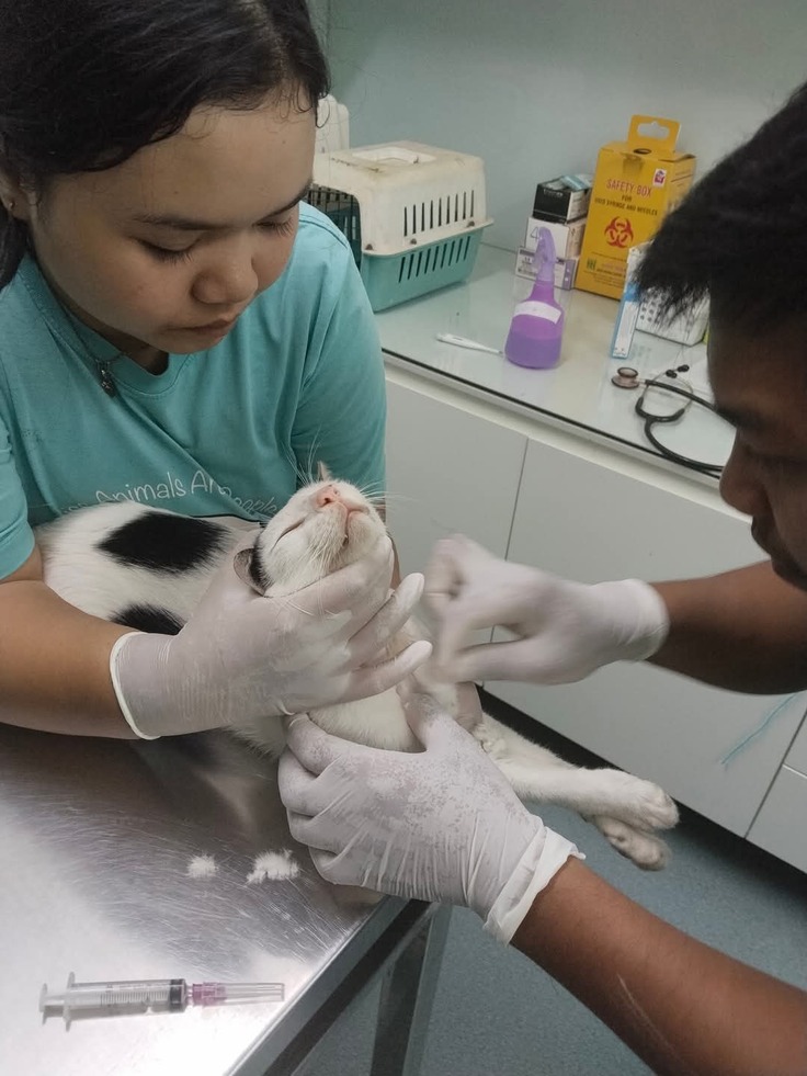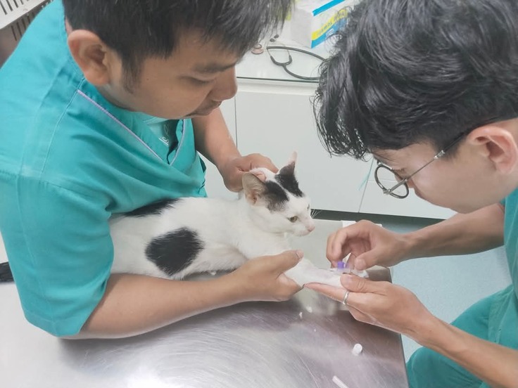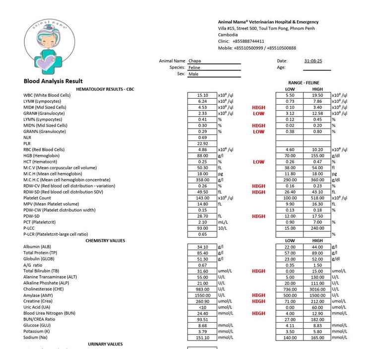 さて、チャパの面倒を見ていたお坊さんから「チャパが具合悪くて食事も食べられていない。」とメッセージをもらいました。早速翌朝アニマル・ママ・シェムリアップに連れていき血液検査をしたところ、呼吸器感染型マイクロプラズマ感染症と腎臓に関係する問題を持っていることが判明しました😢