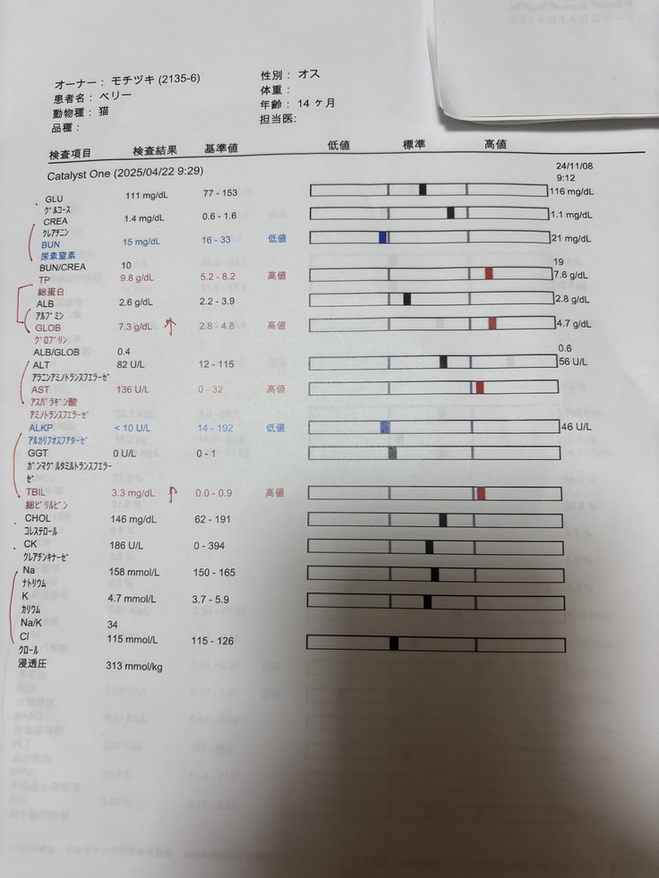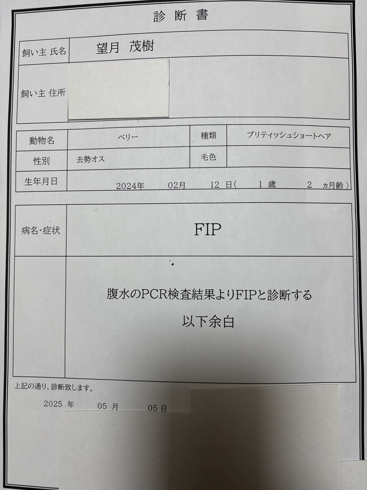 今年4月ベリーの様子が少しおかしくまた以前のように足がおかしいのかと思いましたが、以前約5ヶ月の保護猫の赤ちゃんがFIPで亡くなりました。その時の症状と似ている事もありベリーを病院へ連れて行きました。かかりつけの病院へ行き血液検査をしました。この数値だともしかしたら猫コロナかもしれないと言われました。FIPを扱ってれ病院を探して行くのもいいと言われ次の日、高速道路を使い1時間ちょっとの病院へ行きました。血液検査をして外部に依頼して結果は数日後に。ほぼ間違いなくFIPだと言われ数日後の結果が出る日にまた病院へ行きFIPウエットタイプだと診断されました。それから薬の飲ませ方や色々説明され薬の高額にびっくりしましたがクラウドファンディングで命を救われた事を知りました。ベリーを救いたい一心からクラウドファンディングを決意し、ベリーの命を救いたいです。