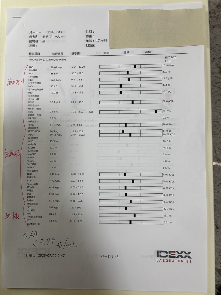 血液検査、肺水 胸水共に正常でした。