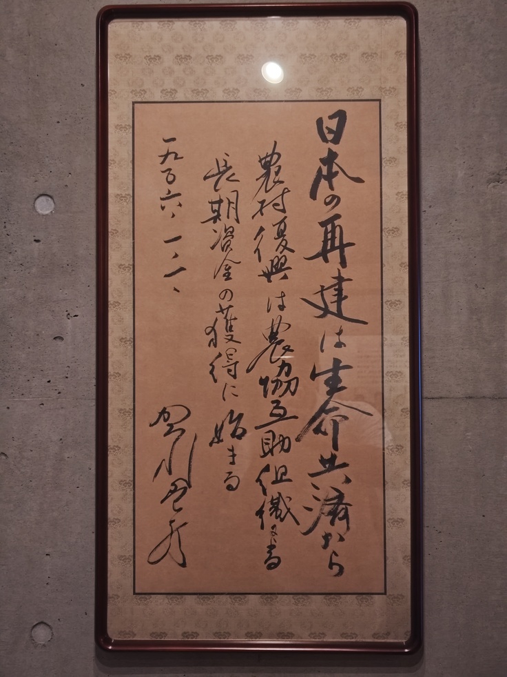 最初にお伝えするのは、当館の常設展示室に展示されている賀川豊彦の共済に関する揮毫となります。こちらの揮毫の原本はJA共済連全国本部役員会議室に掲げられておりますが、複写したものを当館並びに全国のJAやJA共済連各本部で大切に保存しております。こちらは1956年の1月1日に賀川が書いたもので、「日本の再建は生命共済から 農村復興は農協互助組織による長期資金の獲得に始まる」と記されております。1947年の農業協同組合法に共済規定が盛り込まれることによって、協同組合による共済事業が可能となりました。全共連(現JA共済連)は共済運動推進のために協同組合共済の生みの親ともいうべき賀川に揮毫を依頼して、記されたものとなります。このような貢献から賀川は「JA共済の父」と呼ばれ、現在のJA共済・CO・OP共済・こくみん共済Coopといった各協同組合共済の発展の礎となりました。