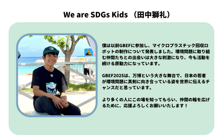 全国の子どもたちが「地球の未来」について学び、自らの言葉で社会に発信する場「GBEF(Green Blue Education Forum)」を、2025年8月10日に大阪・関西万博「WASSE」ステージで開催します。 このプロジェクトでは、ファイナリスト以外の子どもたちにも発表のチャンスを広げ、より多くの地域・環境から子どもたちが参加できるよう、発表の場を拡大・サポートします。 目標金額:2,500,000円 目標金額の使途および実施する内容:宿泊費、交通費に使用します。 目標金額の使途および実施する内容:プロジェクトでは、GBEFファイナリスト以外の子どもたちにも発表のチャンスを広げ、より多くの地域・環境から子どもたちが参加できるよう、発表の場を拡大・サポートします。 ※本プロジェクトは、支援総額が期日までに目標金額に届かなかった場合でも、自己負担するなどして、必ず予定していた規模の実施内容の通り実行致します。