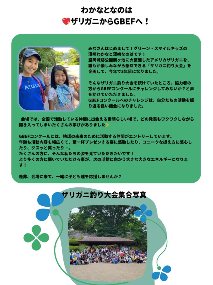 目標金額の使途および実施する内容:プロジェクトでは、GBEFファイナリスト以外の子どもたちにも発表のチャンスを広げ、より多くの地域・環境から子どもたちが参加できるよう、発表の場を拡大・サポートします。