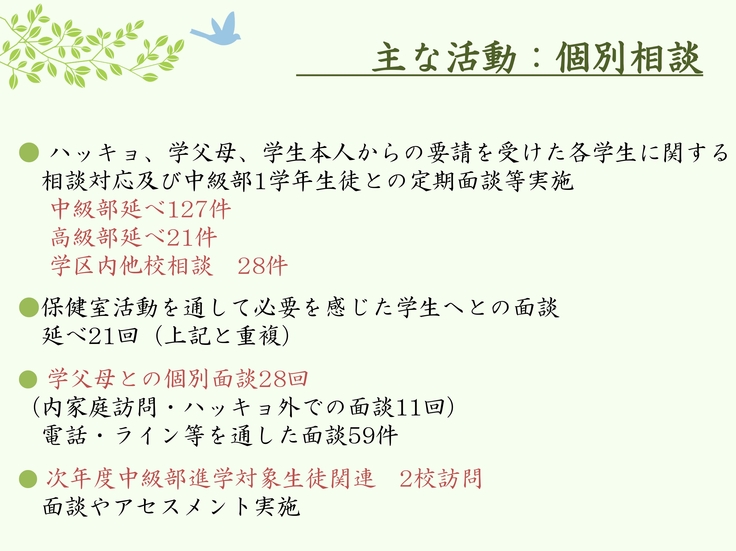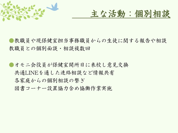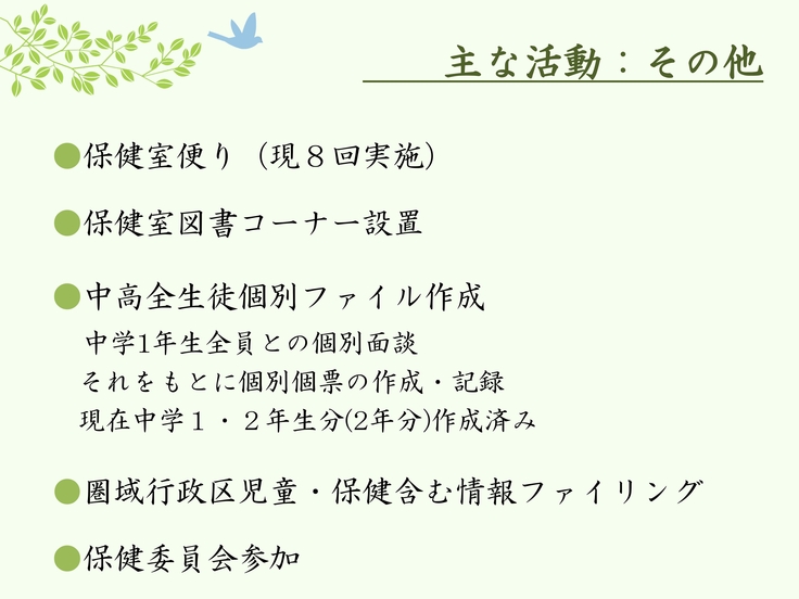 故に福祉団体として、近年特に深刻な問題となっている子供たちの不登校や心のケア、校内での居場所を確保するため、保健室の需要の高まりの中、社会福祉士の先生に相談し、2023年度よりボランティアでの保健室活動を開始。