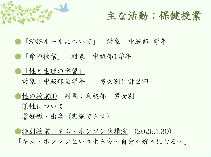 現在保健授業は「できる限り」実施しており、カリキュラムや学年単位で消化する内容にもばらつきがあり、講師の確保も難しい、当然ボランティアでの展開であるため、今後はカリキュラムを確立し、専門知識のある専門家を講師として誘致し、カリキュラムかされた授業を実施できるようにしたい。