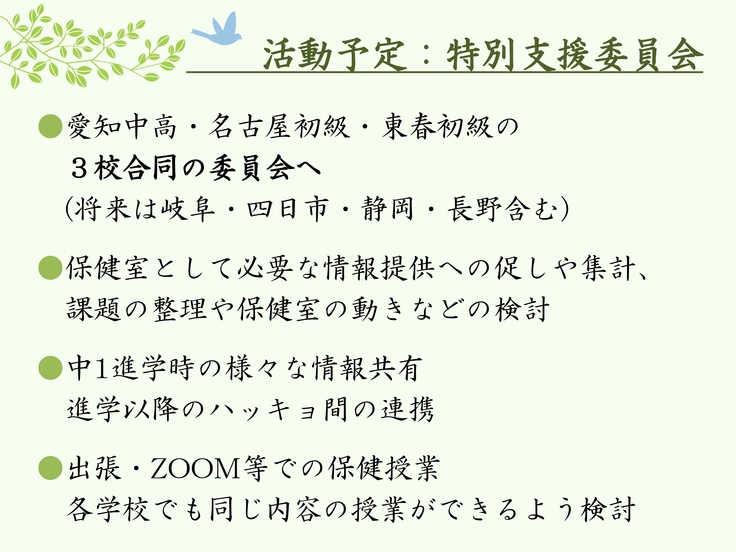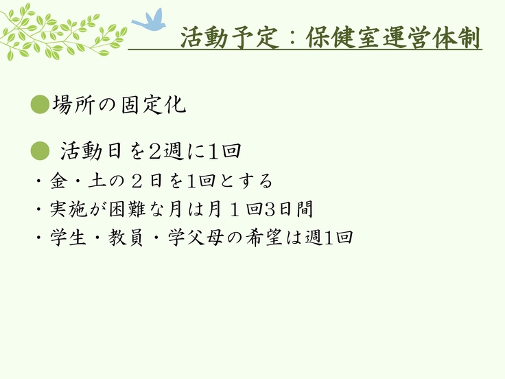 現在ボランティアで月3日限定的に従事しているスタッフを中心に、平日週3日間の保健室の先生のシフトを組んで、いつでも子供たちや先生たちが気軽に訪れることのできる保健室を作る。