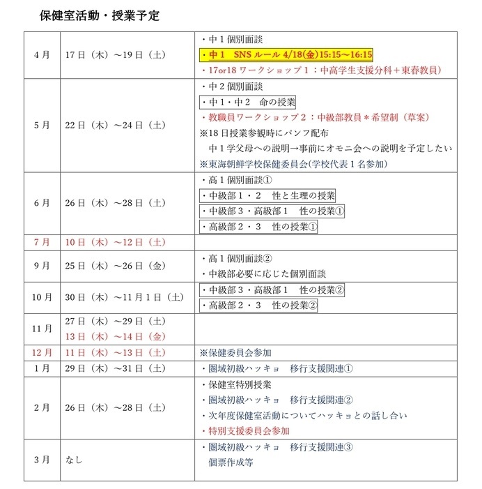 そして、在日コリアンの医師たちにより毎年春に行われる各種検診は、ボランティアで行われいる手前、全校に対するアプローチができず、現実的に実施できる学校とできない学校とがあり、実施される年とされない年がある。これを、保健室に人員を常駐させることにより、日程調整や実施チェック機能をもって、確実に実施できるようにする。