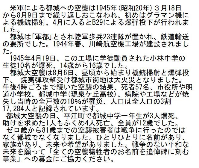 都城空襲犠牲者追悼碑に、全ての空襲犠牲者のお名前を追加して刻みむため、募金を始めました。