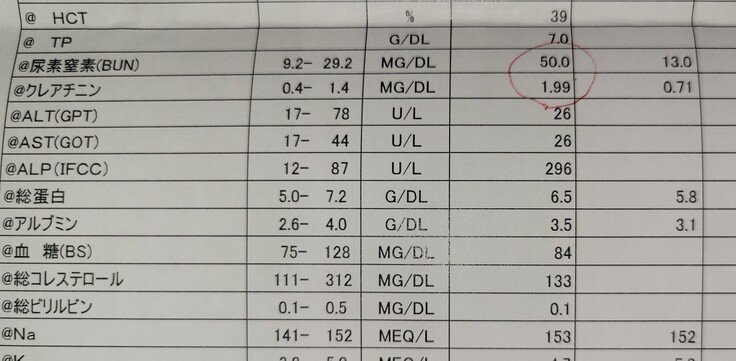 ↓の赤丸が腎臓の数値(本日)で、右側は7月1日です。数値が急上昇してしまっています。