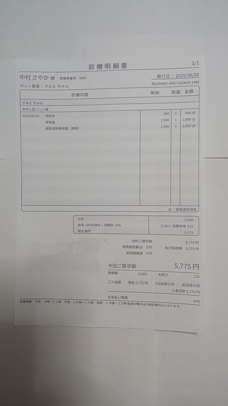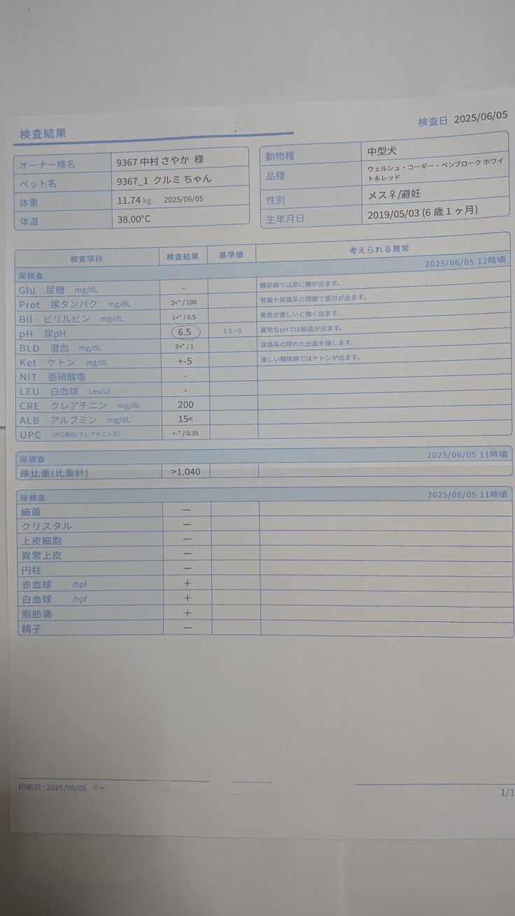 6月4日にクルミのおしっこの回数が異常に多いのと血が少し混じってるのに気がつき病院に連絡したところ明日きてくださいと言われ6月5日に急遽、病院に行き診察、検査をしていただいて結果は抗がん剤による副作用とのことでした。