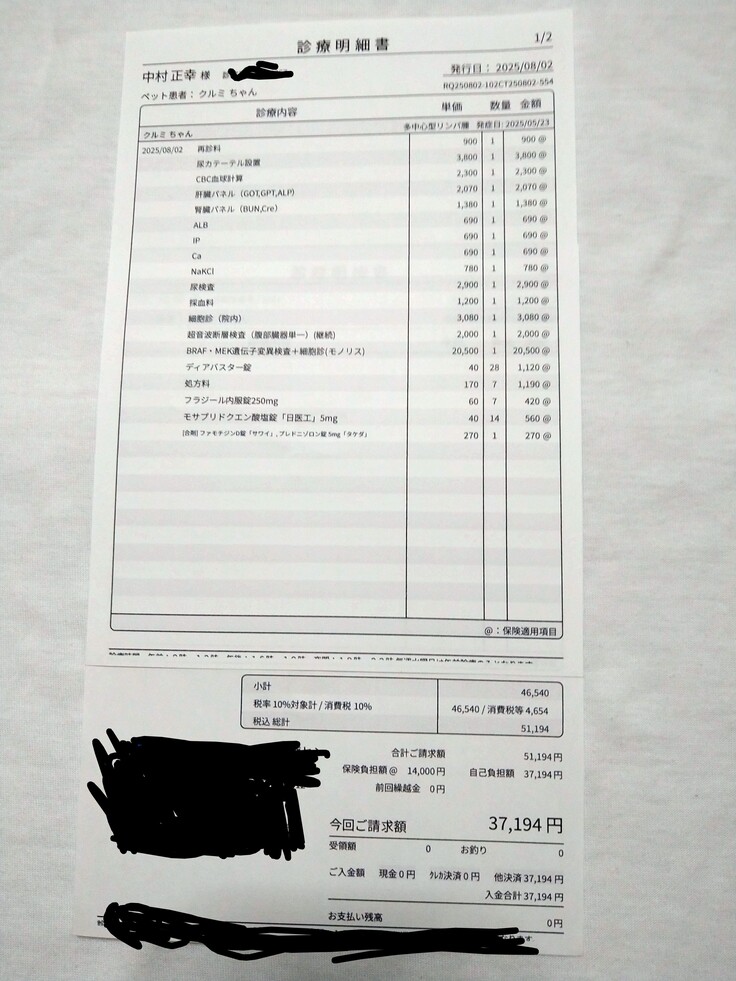 尿検査、膀胱の状態の検査等して頂き結果は腫瘍ではなく抗がん剤の副作用によりカルシウムが蓄積して腫瘍みたいに見えたみたいです!
