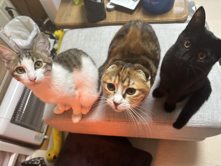私の娘達は、5月30日で1歳になるスコティッシュフォールドと三毛のミックスの桃と、推定7月で1歳になる白キジ猫のモカと黒猫のハッピーは姉妹です