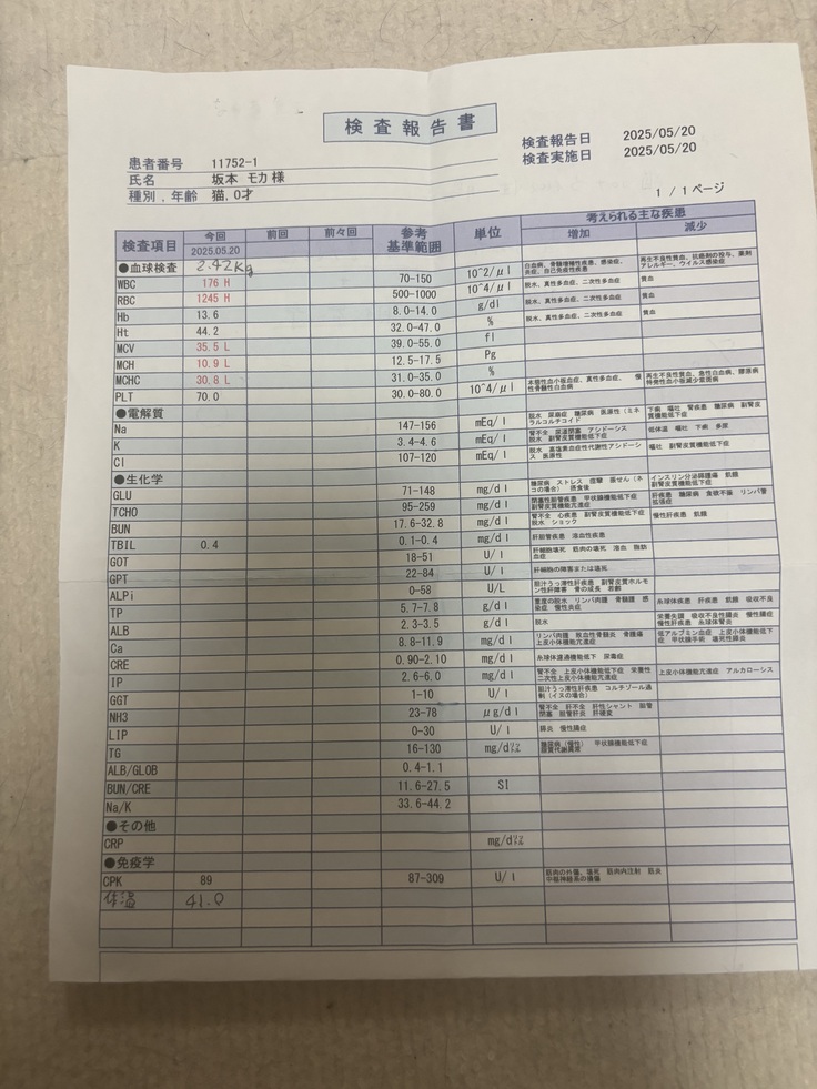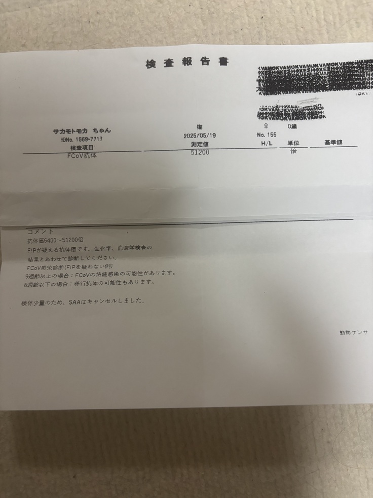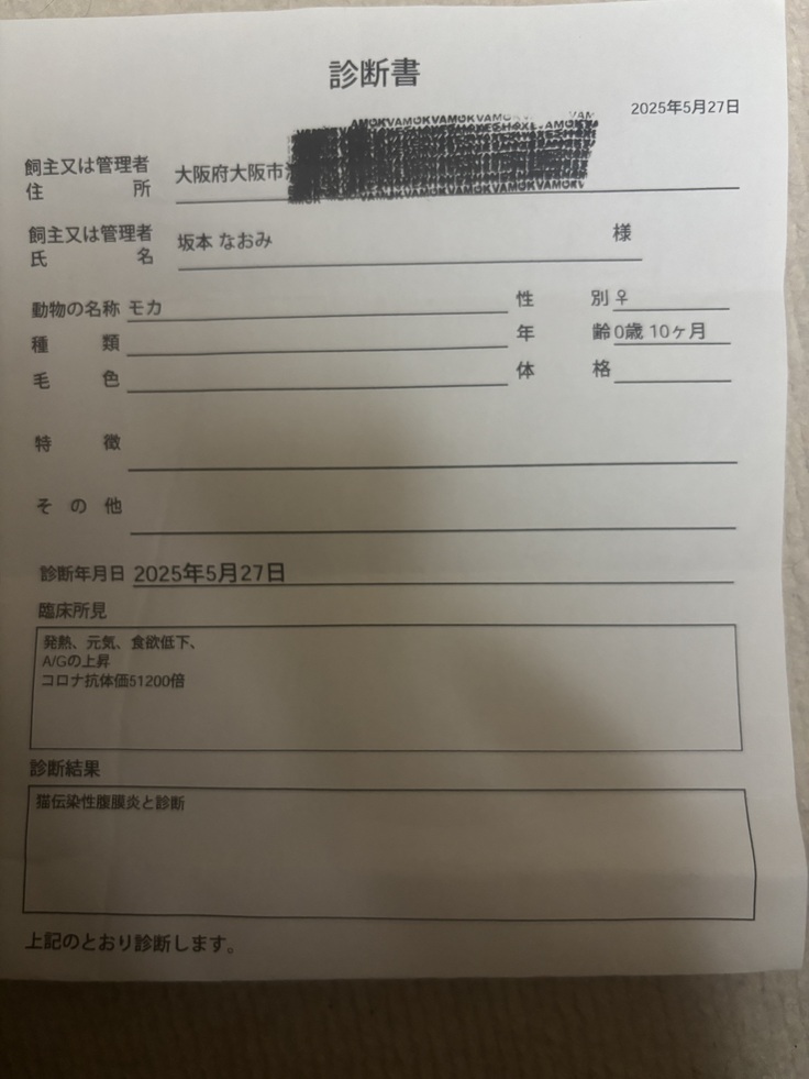 2週間程前から、モカの元気が無く、大好きなご飯も食べなくなり、特に寝起きは動かないので、病院で血液検査したところFIP(猫伝染性腹膜炎)ではないかと診断を受けたのですが、そちらでは確定診断ができなく、治療もしていないとの事で、専門の先生が居る病院を探して検査(血液検査、エコー検査、腹水検査)をして、FIPと診断されました