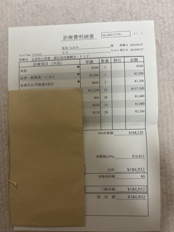 効果のある薬と、安価ですが効果は半分ぐらいの薬(軽傷の子用)があるとの事でしたが、先生も驚く程の抗体値だったのと、辛そうなモカを助けて下さいという思いもあり、効果の高い方をお願いしました