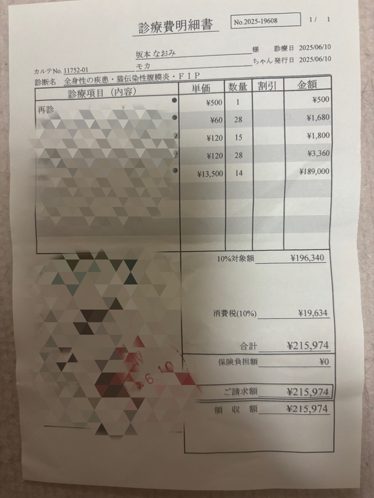 6月10日に病院で受け取った2週間分のお薬代ですが、今回はモカの100g体重が増えた事により、少しお薬の量が増え金額も少しあがりました。