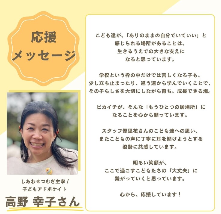 応援メッセージありがとうございます!国分寺・小金井エリアで多くのこどもたち・保護者を支援してきた方からのメッセージ、とても頼もしく力になります。こどもたちの「大丈夫」に繋げられるよう、活動を続けていきます!