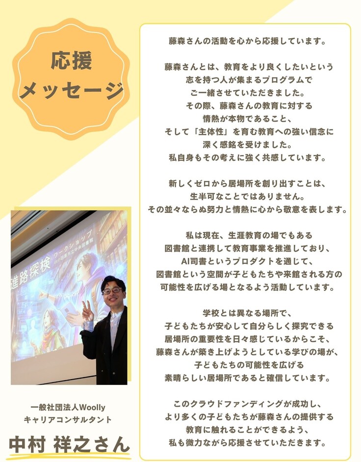 応援メッセージありがとうございます!学校以外に多様な学びの場を作っていく仲間として、私も応援しております!