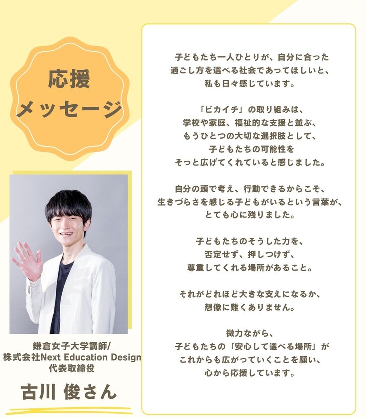 こどもたち一人ひとりが自分らしく過ごせる社会の創造にむけて、これからも尽力していきます。古川さんのデザイン講座を、こどもたちと一緒に体験出来る日を楽しみにしています!
