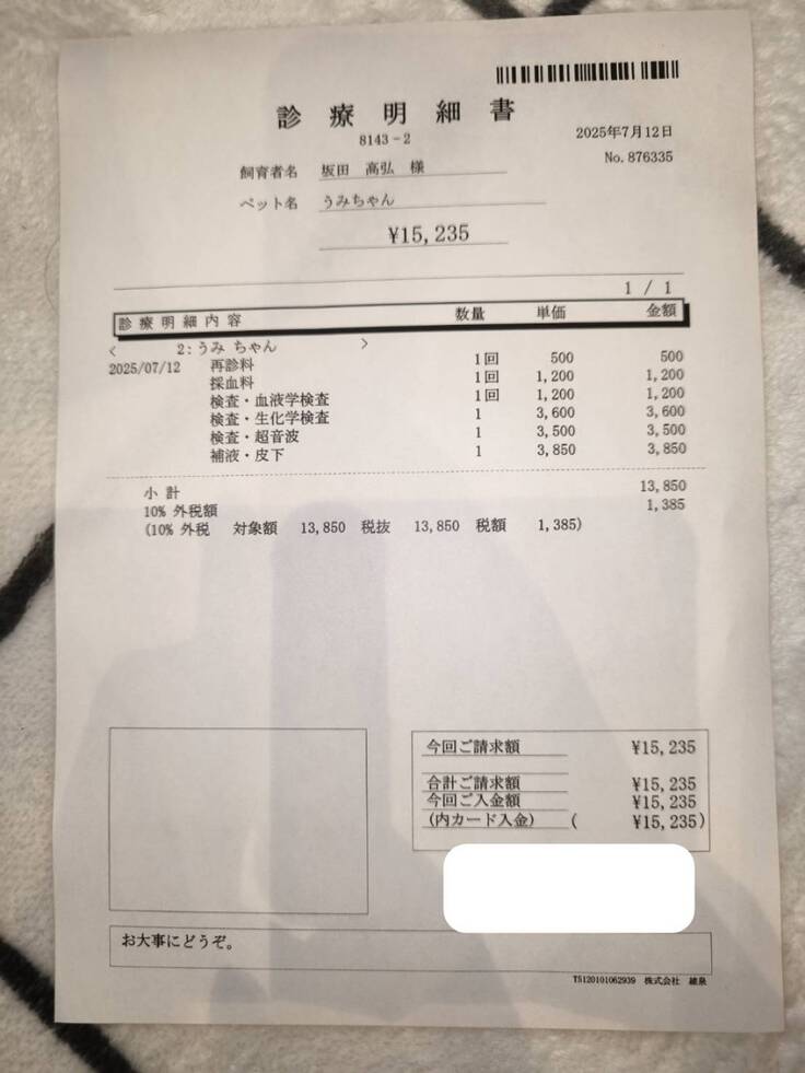 病院に着くとすぐに血液検査とエコーで状態を確認してもらい、皮下点滴を実施して貰いました。