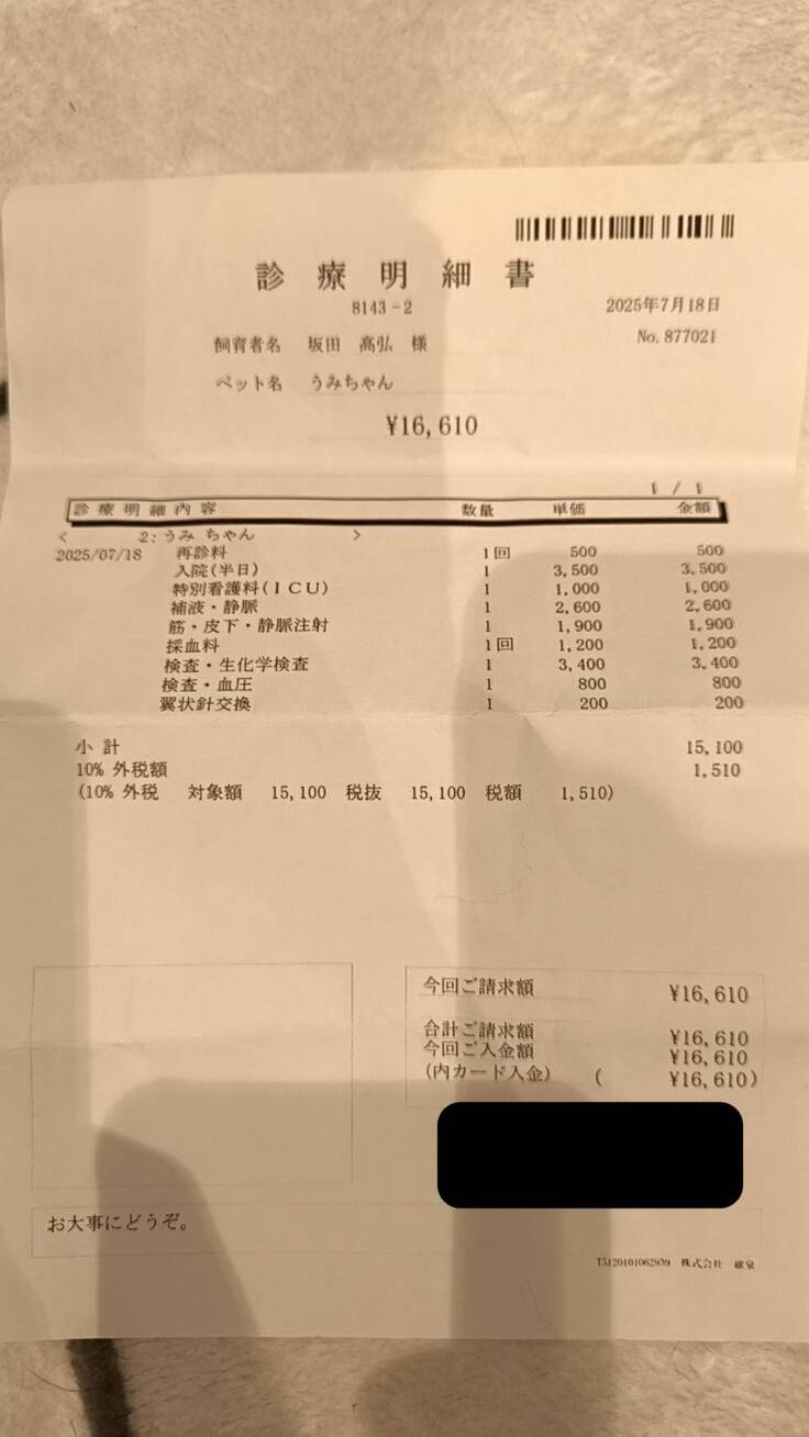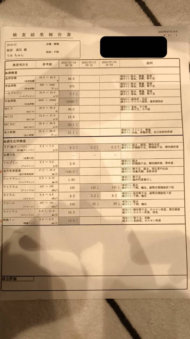 ただ脱水気味だったので腎臓の数値が少し悪いとのことですが、明日から腎臓をケアする点滴を行っていくのでこれも改善していくはずです。