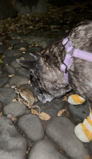 境内では、雨上がりのせいかたくさんのカエルたちが出てきていて、ベラは楽しそうに近づいていました。