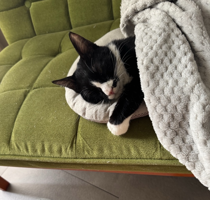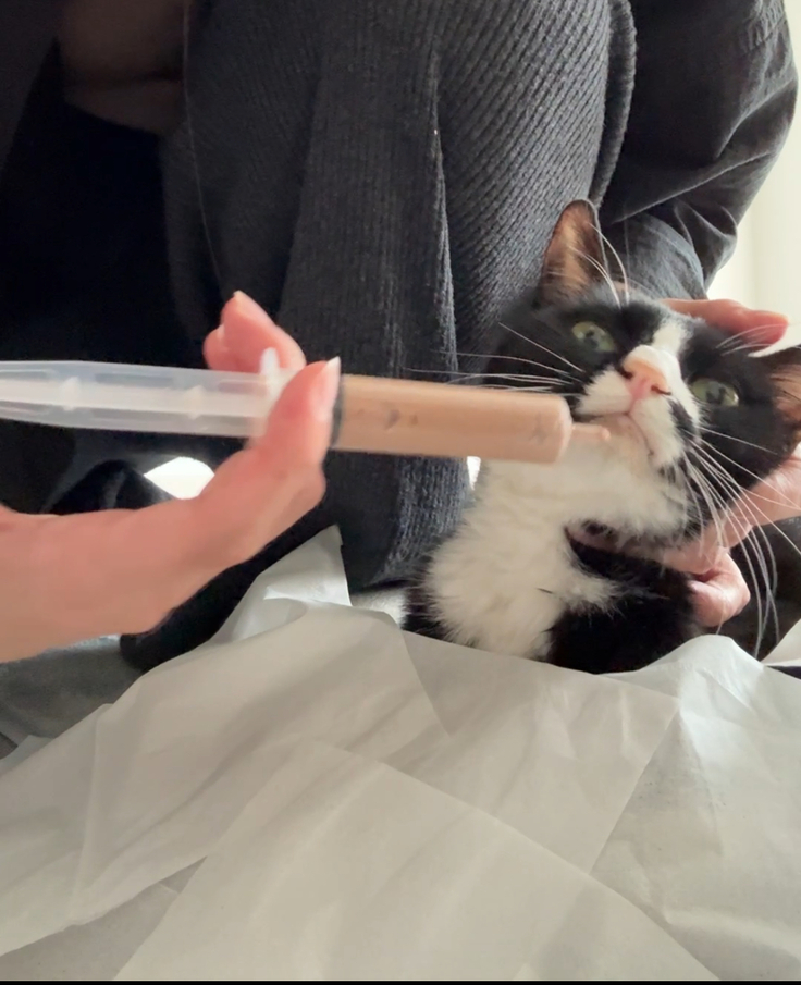 2025年5月25日の夜、アルの様子がいつもと違うことに気づきました。 歩くときに足がふらつき、その後こけました。これはおかしい、と思い慌てて夜間救急の動物病院を受診しました。血液検査、CT検査を行ったものの、これといった異常は見つからず、痛み止めを処方されひとまず様子を見ましょうということでそのまま帰宅しました。 ところが翌日、アルはさらにぐったりとしてしまい全身が震え。歩くこともままならなくなり、再び病院へ。 そのとき言われたのは、「検査しても大きな異常はなく原因がわからない。しかし、低体温で危ない状態です。覚悟をしてください」との言葉でした。 頭が真っ白になりました。 どうにか助けたい一心で、譲渡を受けた保護猫会の方に相談したところ、保護猫をたくさん診てこらているという別の動物病院を紹介していただき、すぐに受診しました。 そこで初めて、「FIP(猫伝染性腹膜炎)の可能性が高い」という話しをいただき、すぐに投薬治療を開始することになりました。