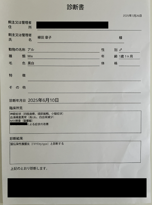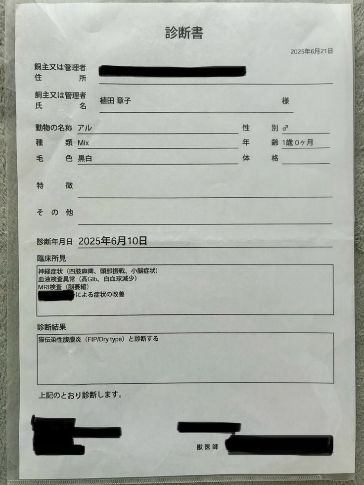 昔に比べ、認知度のあがってきた疾患だと思いますが、FIPという病気には、まだ原因も治療法も分からない部分が多く残っていることを知り、アルの発症〜治療過程を同じような状況の方に届けたいと思っています。